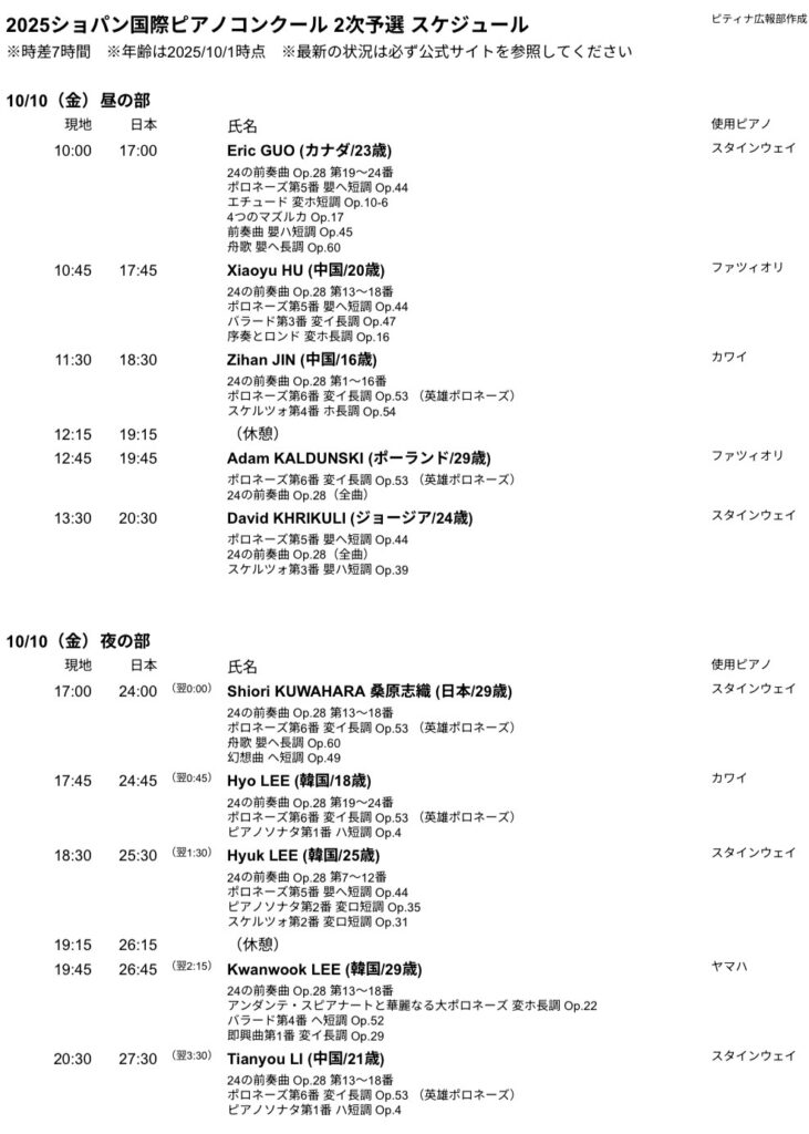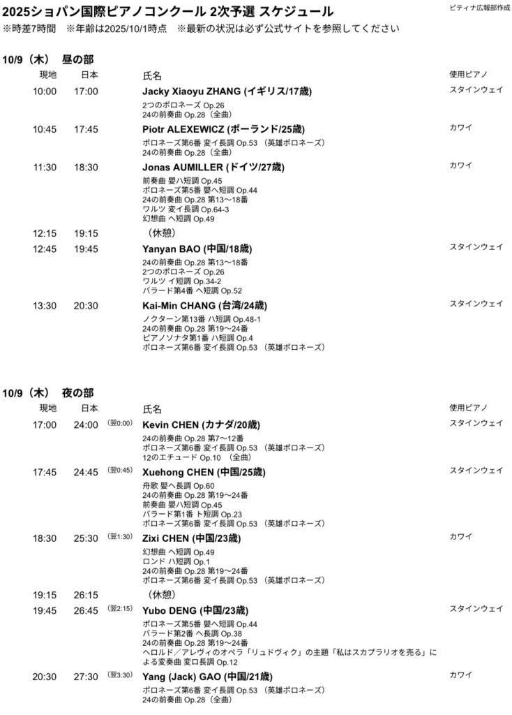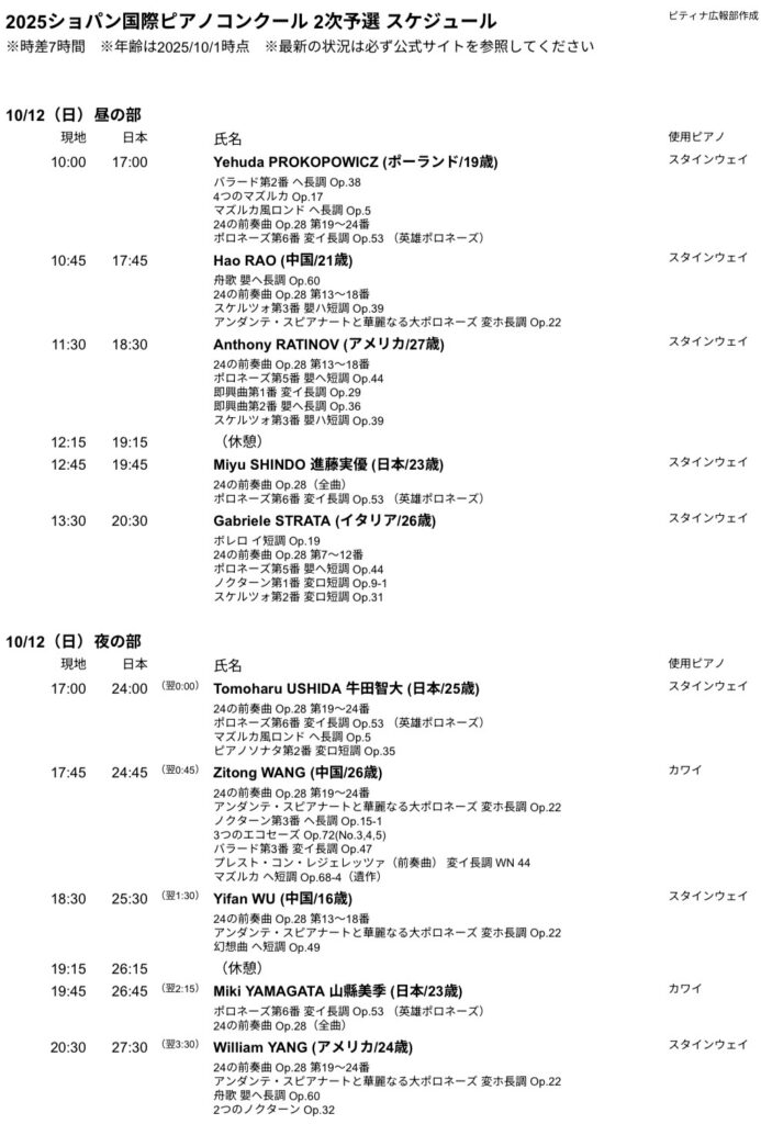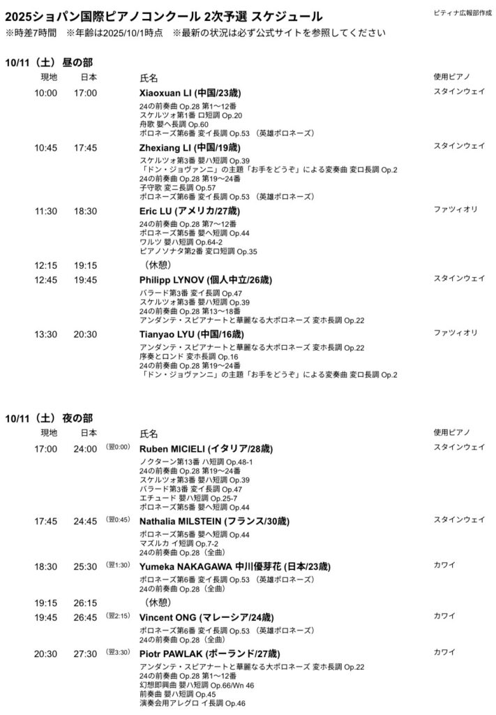 そこで演奏を聴きながらピティナ ピアノnoteさんが作ってくださったPDF「2025ショパンコンクール2次予選全出場者出演順と曲目(ピティナ広報部作成)」を利用されていただいています↓↓年齢や使用ピアノまで載っていて大変参考になりますありがとうございます!