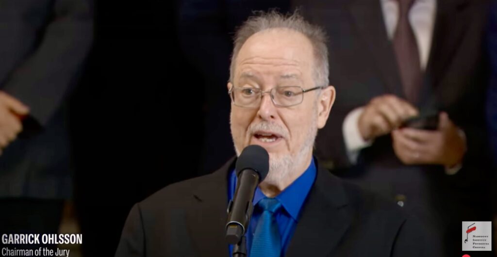 結果発表までにずいぶん時間がかかりましたが「審査員長の簡単な挨拶」ということでギャリック・オールソンが「我々はいくつもの難しいディスカッションにとても一生懸命に取り組んだ。それで長い時間がかかってしまった。しかしそれを乗り越え良い結論がでたと思う。皆さんおめでとう」と短くお話をして発表がはじまりました。第18回の動画見たら発表まで4時間だったけど、今回は5時間!ピアニストの皆さん、審査員の先生方、本当にお疲れさまでした。