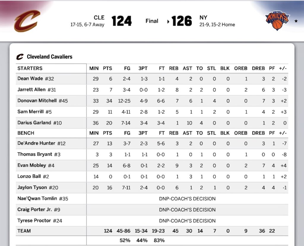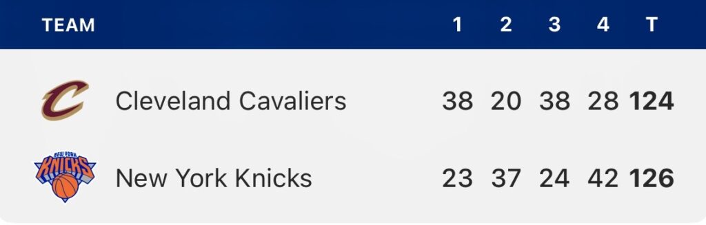 3Q:71−71同点からキャブスの18−4ランでビハインドが広がり96−84ニックス12点ビハインドで終了。