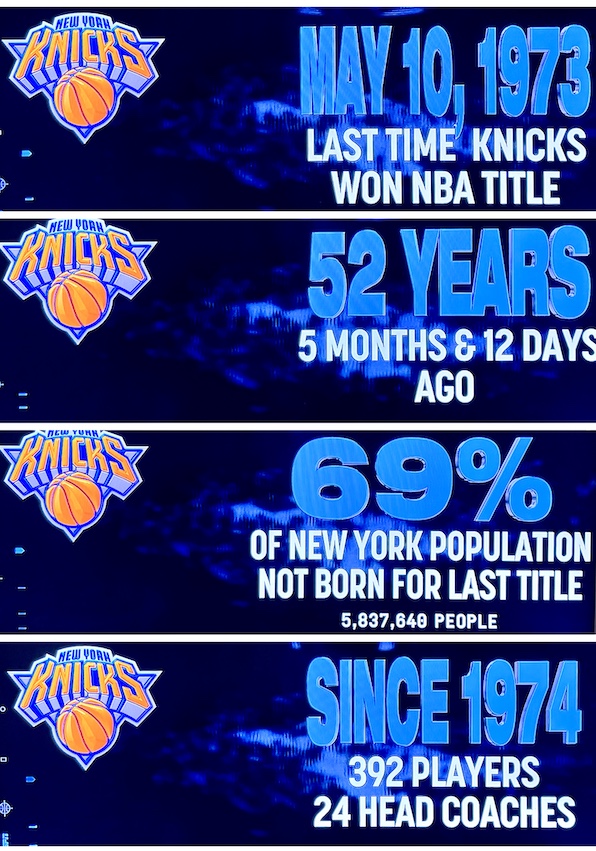 「前回の優勝は1973年5月10日。それから52年5ヶ月と12日が経ち、現在のニューヨークの人口の69%は前回の優勝の時に生まれていなかった。1974年以来ニックスのヘッドコーチは24人、選手は392人がプレーしてきた」って調べてくれたのね〜