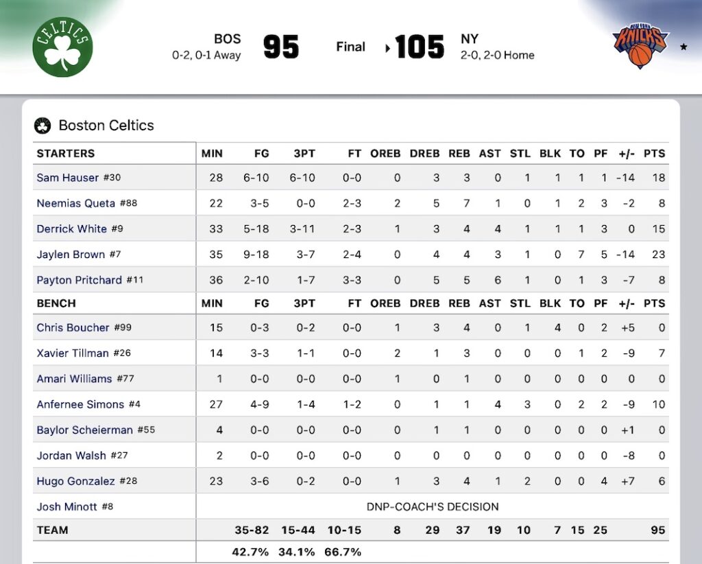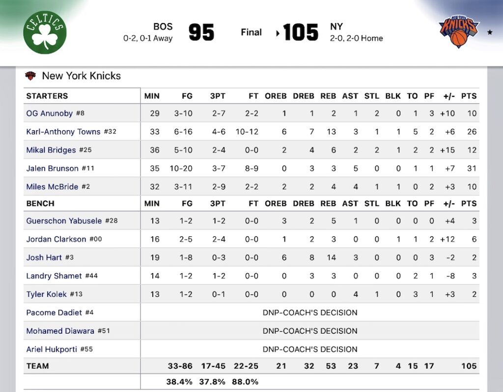 リバウンドが強いニックス!BOS37、ニックス53で今日も+16! セカンドチャンスからの得点がBOS7点に対しニックス21点でこれも話題になってた〜