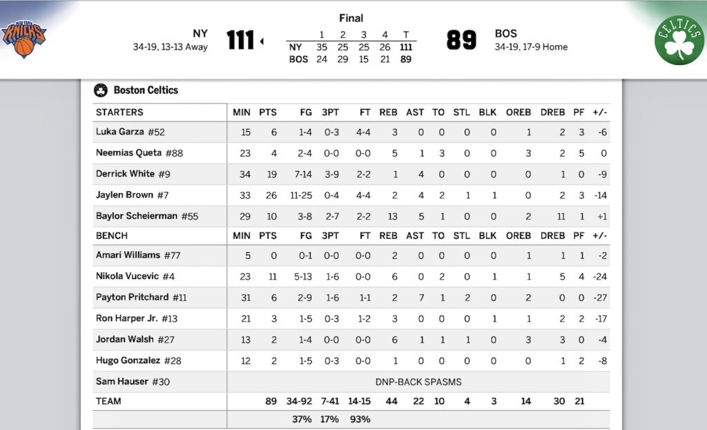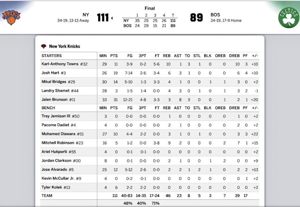 試合は1Q35−24(ブランソン15得点)ニックス9点リードで終了。以降リードが続く。セルティックスが3Qで数回4点差に迫ってきたけど逆転されることは無いまま残り6分辺りからリードを広げ4Qではこの試合最大の24点差。最終は111−89でニックスWIN!!! 89点はセルティックス今季最少得点だそう ニックスは80点だけど あれ? 皆んなディフェンス頑張ったと話題に