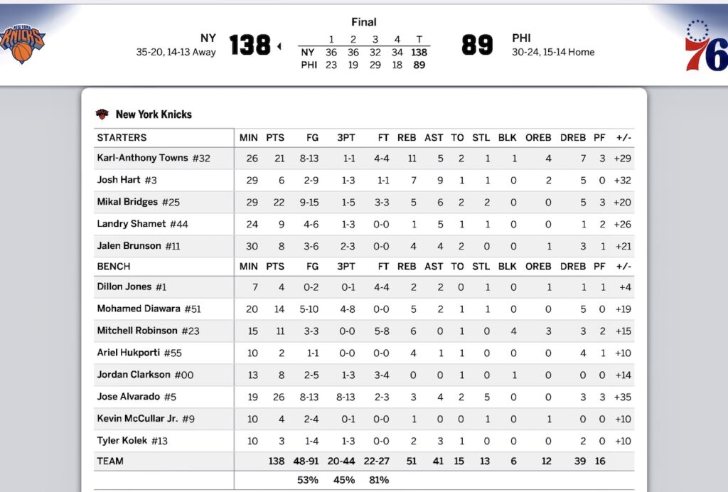 ディアワラ スリー4本決定(キャリアハイタイ)、ベンチ勢で72得点の大活躍!ブランソン30分8得点(3pt2-3)&シュートアテンプト6本はシーズンロー(怪我で出場5分だったキングス戦除く)「キャップは皆んなのためにプレーして8得点でもチームは138得点、ボールムーブが素晴らしい」と話題になっててさすが♡