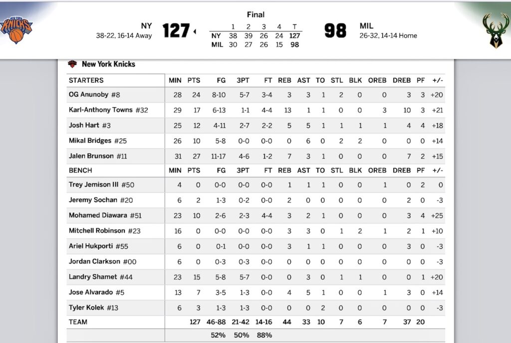 以来2日間試合なくて、今日はスタートから元気なニックス!スリーも決まるホッ。順調に点差を広げ最大32点リード。4Qは残り6〜7分から交代し始め、スタメンの皆さんは早めにベンチへ→ガベージタイムとも言う。ティブスのときからニックスには無いけど最終はバックスを98点に抑えてニックスWIN!!!