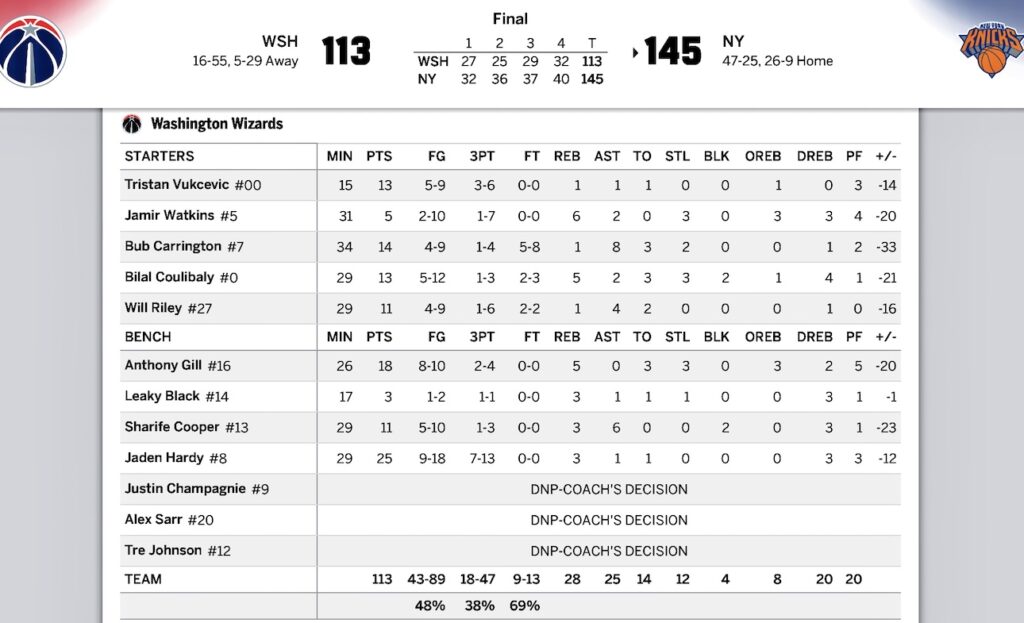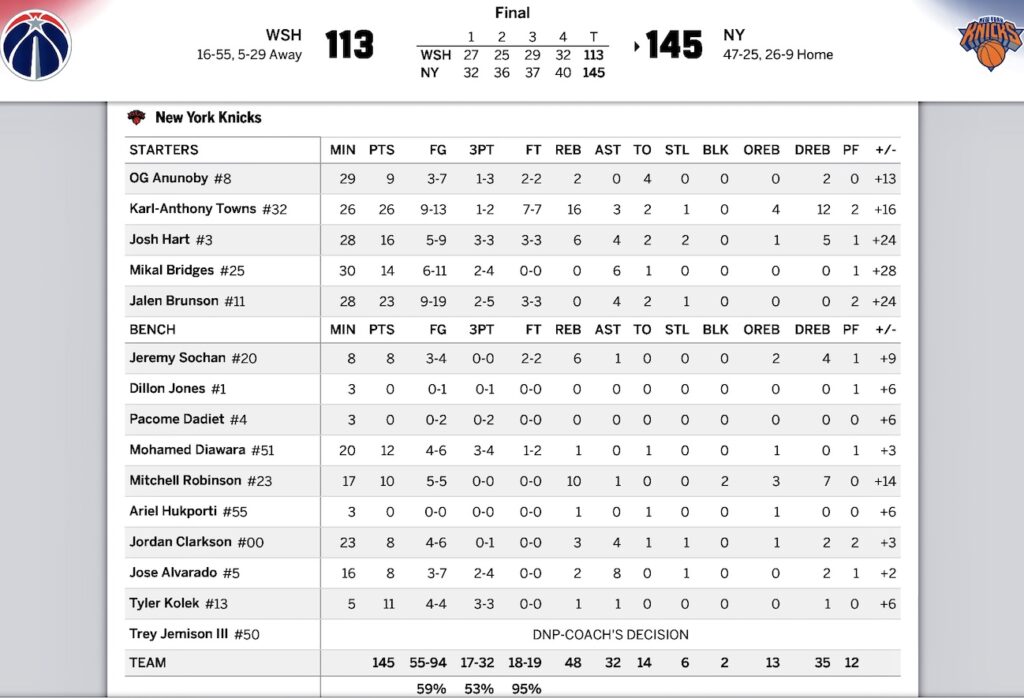 [NBA] ニックス 2025-26第72戦対ウィザーズ〜ファストスタートから32点差で勝利