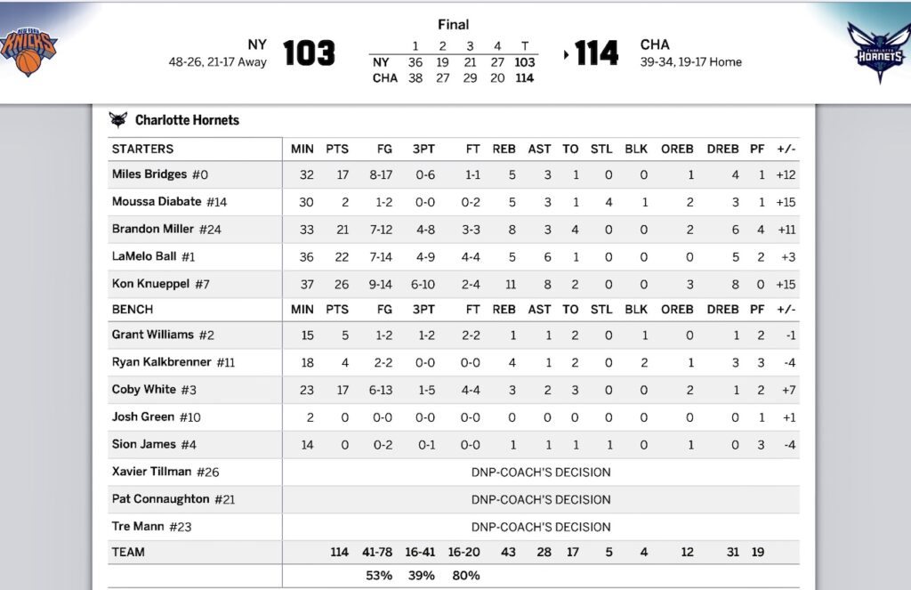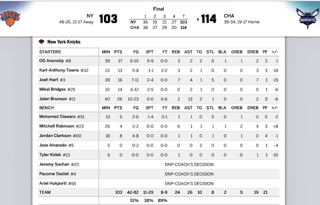 1Q ホーネッツのスリー6−11(55%)&FG14−20(70%)ひ〜っ一時10点ビハインドあんなにスリーに注意!と言われてたのに〜!でもブランソン17得点で36−38ニックス2点ビハインドで終了ラッキーか「トランジションDがひどい」「ニックスは誰も動いてない」「一歩遅い」byフレイジャー 2Qは最後ホーネッツの15−6ラン、ニックス10点ビハインドで終了。インテンシティが今ひとつでリバウンドが取れないニックスはその後ビハインドが拡大、最大21点差。4Qでエナジーが見えた場面あって終盤一桁差になったけどもう遅い。結局後半は一度も僅差で競ることないまま最終は103−114で負・け・た!