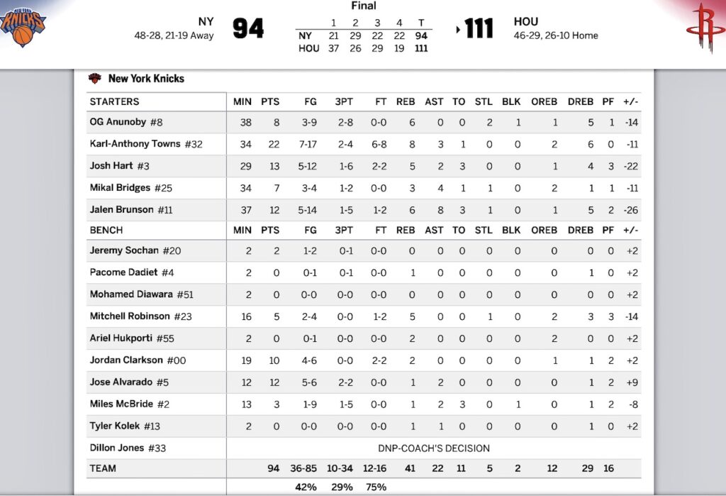 ブランソンのFT1本決まり1−0で試合をスタートしたけど、その後は終始ビハインドだった今日の試合。1Qスロースタートで一時17点ビハインド、ロケッツ37得点←取られすぎ。2Qホゼの元気で中盤4点差に迫ったけど続かず。4Qを20点ビハインドで迎え最大21点ビハインド。最終は94得点しかできず3連敗〜