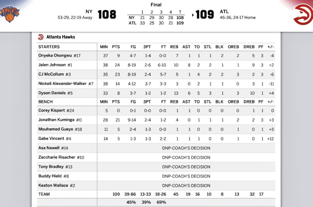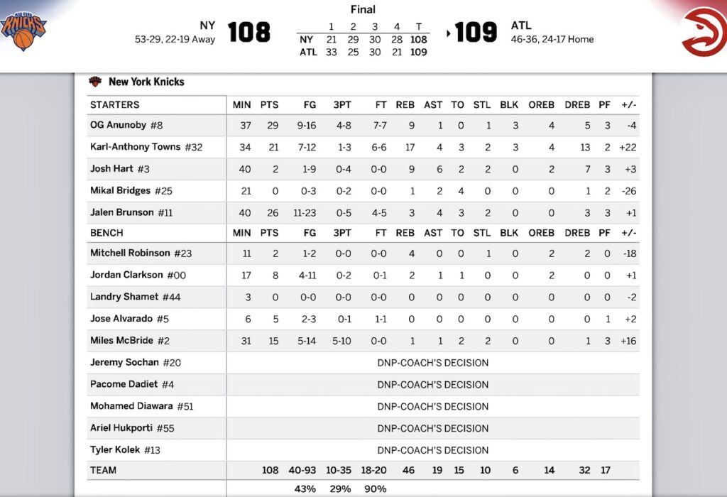 4Qタウンズ&ブランソン不在で連続ターンオーバー。10点ビハインドになったところでブランソン、デュース、ハート、OG、タウンズ「今日ビハインドから追い上げたラインナップ」byタイラー FTとデュースのスリーで点差縮める。OGのミラクルスリーで2点差!残り2分OGのミラクルスリー再で1点差!!OGOG ATLの得点は省きます デュースのスリーで同点♡、残り1分キャップの3点プレーで108−105逆転3点リード♡♡久々〜だけど残り13秒CJにシュッと逆転されニックスタイムアウト「コートのトップを動き回りブランソンの得意な右側を空けたかった。彼には”Go get it 勝ってこい”と伝えた」byコーチ やはり作ったプレーだったのか?‥ そして指摘されてた複数プレーを経て最後一度はブランソンの手にボールが渡ったけど‥シュートに行けないままターンオーバーで終了〜 ↓レジェンド達も応援してたのに残念