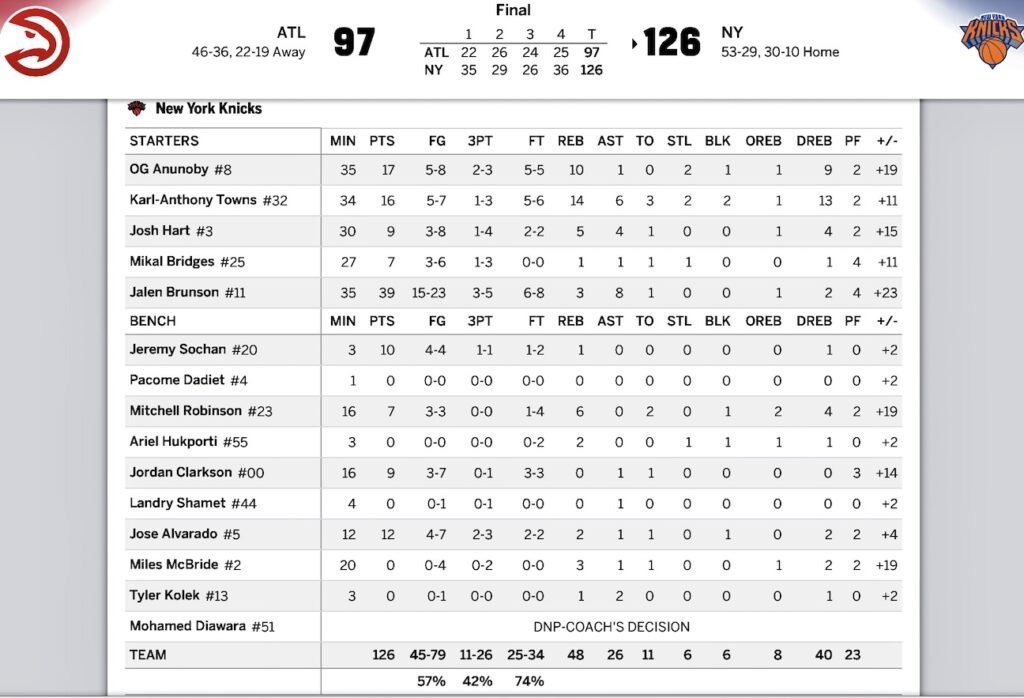 両チームフィジカルでスタート。KATが「今日もトリプルダブルかも?」という勢いでバランス活躍。2Q一時22点リード。3QでATLが14点差に迫ってきたけど、4Qはキャップタイム〜!ブランソンが次々決めてリードを広げ28点差。残り3分半ベンチの皆さんと交代→コーレック、ホゼ、シャメット、ソーハン、アリエル。ソーハンがスリーも含む10得点!最大32点リード。最終は97−126でニックスWIN!!! MSG Postgameでは「リバウンドとペイントの得点を支配」「トランジションDが良くなった→ATLに走る機会を与えず今日も速攻からの得点を抑えた」 やった〜!