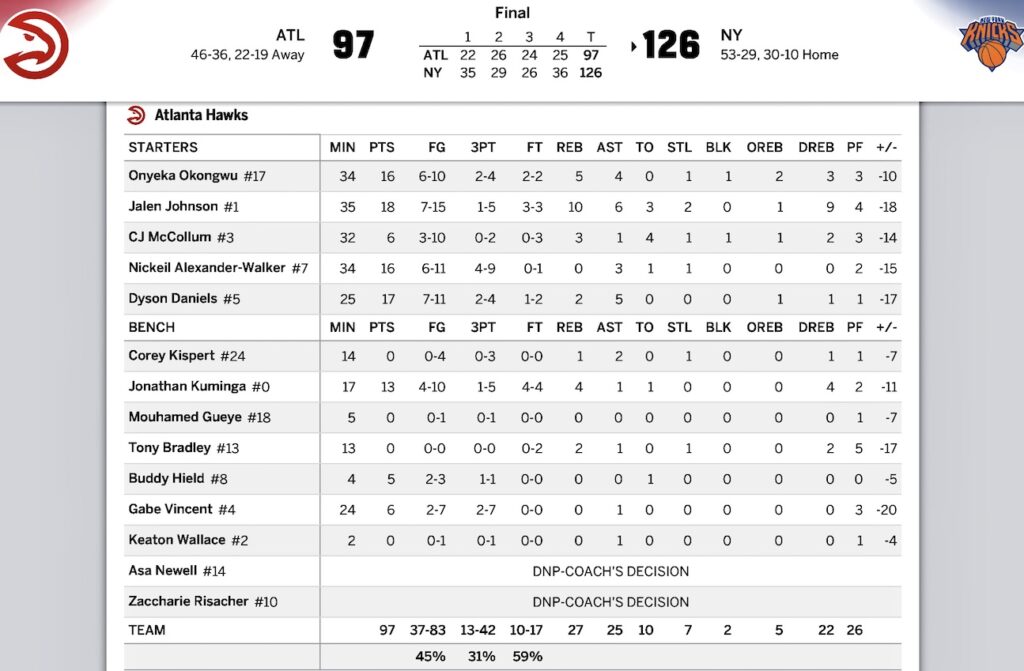 ATL 97 – 126 NY 3勝2敗
